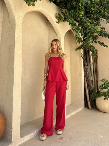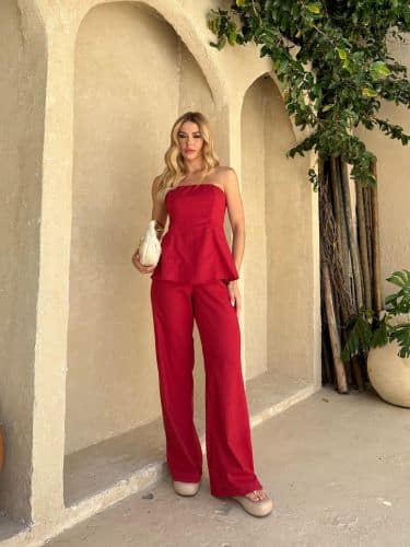 Um conjunto sofisticado e elegante, composto por uma blusa tomara que caia e uma calça em linho premium. A blusa sem alças valoriza o colo e os ombros, com um caimento suave e sofisticado, que traz um ar de leveza e elegância ao visual. O linho premium confere um toque natural, com textura macia e conforto ideal para os dias quentes, enquanto a modelagem da calça é clássica e levemente solta, proporcionando liberdade de movimento. O conjunto tem um visual minimalista e moderno, perfeito para quem deseja um look chic e despojado ao mesmo tempo, ideal tanto para ocasiões formais quanto para um passeio casual.