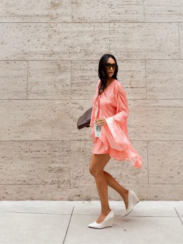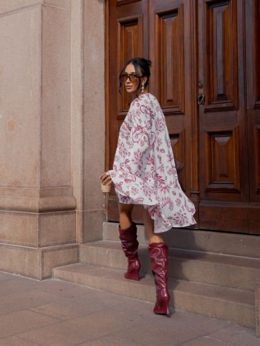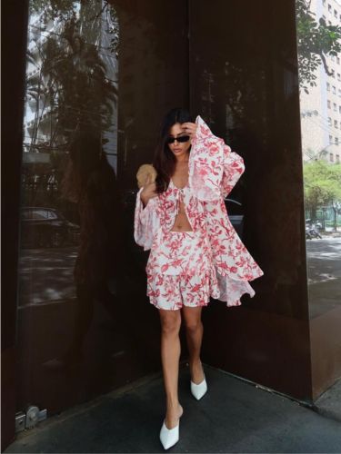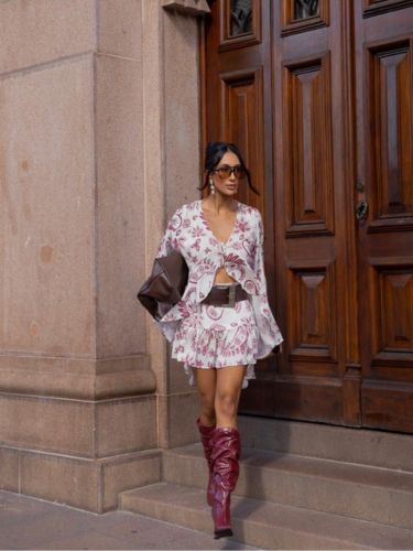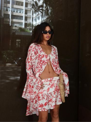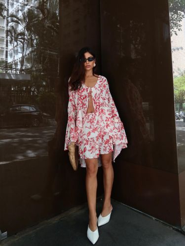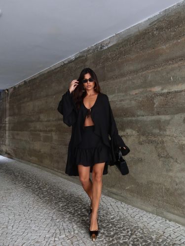 A saia complementa a produção com caimento leve e detalhes que criam movimento ao caminhar, valorizando a silhueta de forma elegante. O conjunto cria uma composição harmoniosa e versátil, ideal para produções que transitam facilmente entre o casual chic e ocasiões especiais.