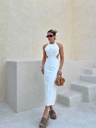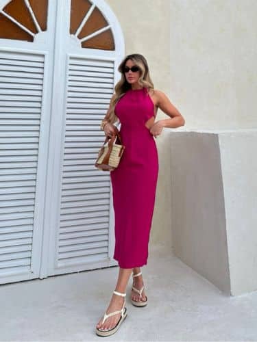 Este vestido midi exala sofisticação e sensualidade com seu design aberto nas costas, destacando a silhueta de forma elegante. O detalhe na cintura adiciona um toque de charme, realçando a figura feminina com sutileza. A fenda na parte de trás proporciona um equilíbrio perfeito entre elegância e movimento, tornando-o ideal para eventos que pedem um visual refinado e moderno.