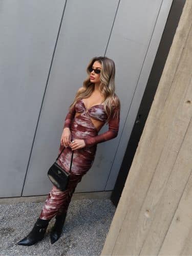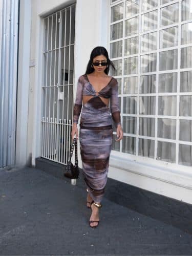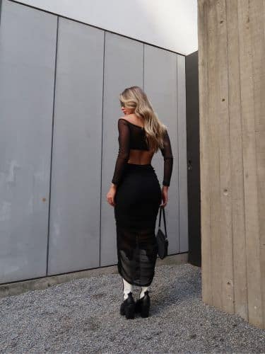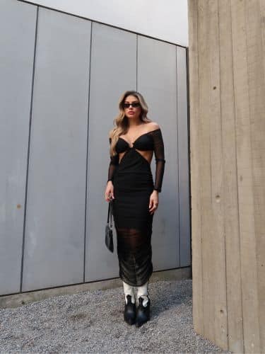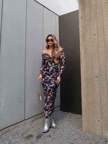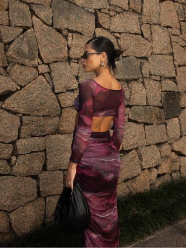 Um vestido deslumbrante e contemporâneo, confeccionado em tule transparente, que exala sofisticação e modernidade. Com mangas compridas que adicionam um toque de elegância, o design inovador deste vestido destaca-se pela presença de uma argola no busto, que serve como ponto focal e eleva o estilo da peça. Além disso, as aberturas nas cinturas conferem um toque ousado e sensual, criando um visual que é ao mesmo tempo atraente e sofisticado. Perfeito para ocasiões especiais, este vestido é uma escolha perfeita para quem deseja se destacar com um look único e elegante.