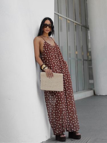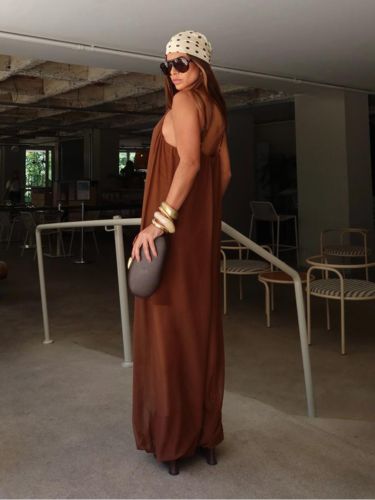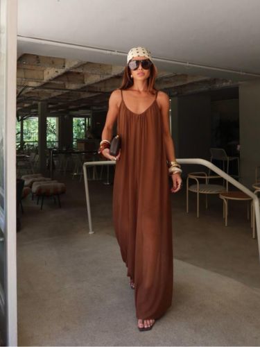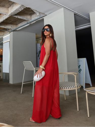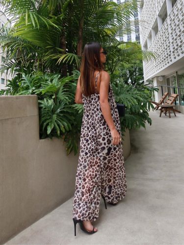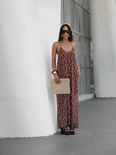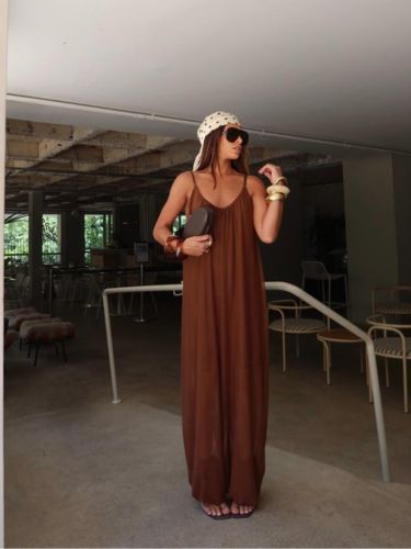 O design apresenta decote profundo e alças finas, criando uma proposta delicada e feminina. A parte superior tem leve franzido, trazendo fluidez ao visual.